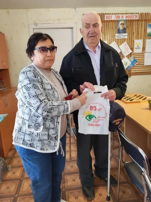 Ему была нужна помощь для оформлении очередного получения ТСР в СФ РФ по Харабалинскому району. По состоянию здоровья Петр Николаевич в прошлом году не смог принять участие в юбилейных мероприятиях, посвященного 100-летию ВОС. Сегодня председатель местной организации Айзада Утеулеевна Мамбетова вручила ему знак Заслуженный работник ВОС, и памятные подарки. После вручения юбилейного знака председатель сопроводила Петра Николаевича в социальный фонд, и помогла оформить ТСР.